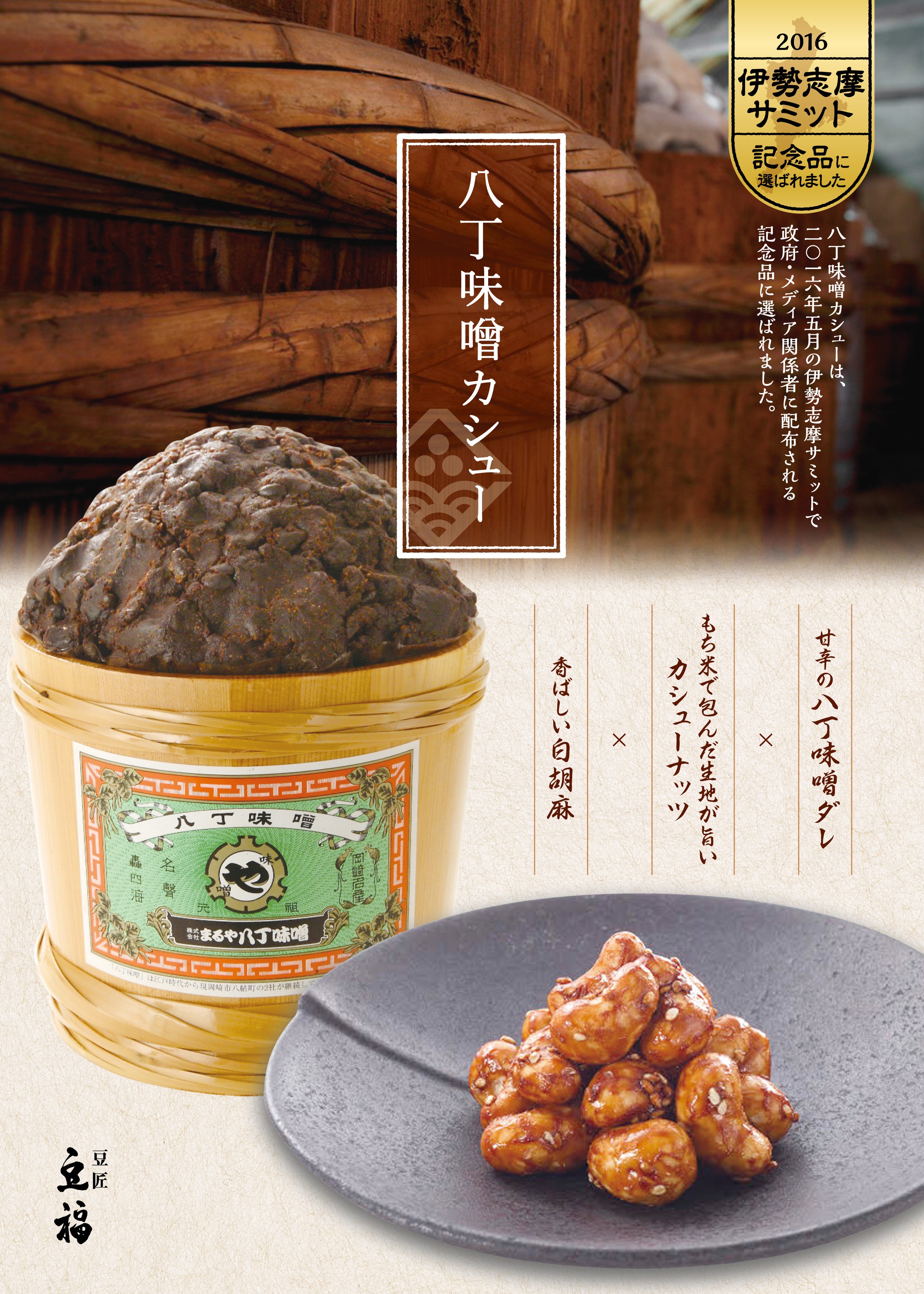 八丁味噌カシューは、大豆と塩から仕込んだ愛知県特産の八丁味噌を、さっくり衣のカシューナッツに絡めた菓子です。発売以来、少しずつ改良を重ね、現在では八丁味噌に、たまり醤油、みりん等を合わせた甘辛い味噌ダレと、相性のよい白胡麻を生地に忍ばせた素朴な味わいに仕上げています。