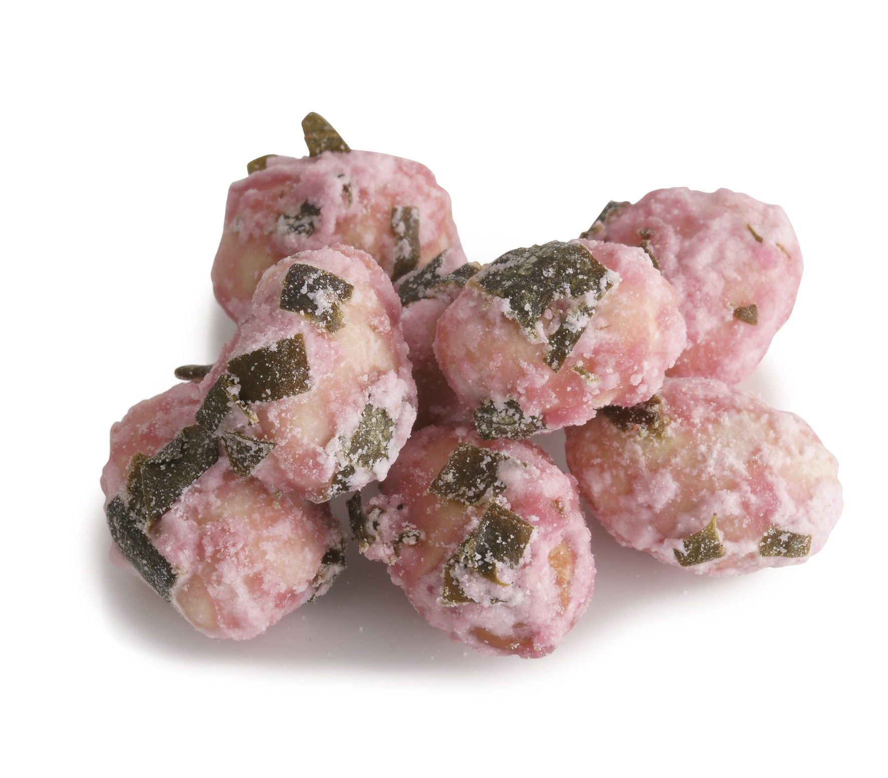 北海道産袖振大豆を桜葉で糖衣がけして、桜のつぼみを表しました。塩漬けした桜葉の香りが大豆の味わいを引き立てます。