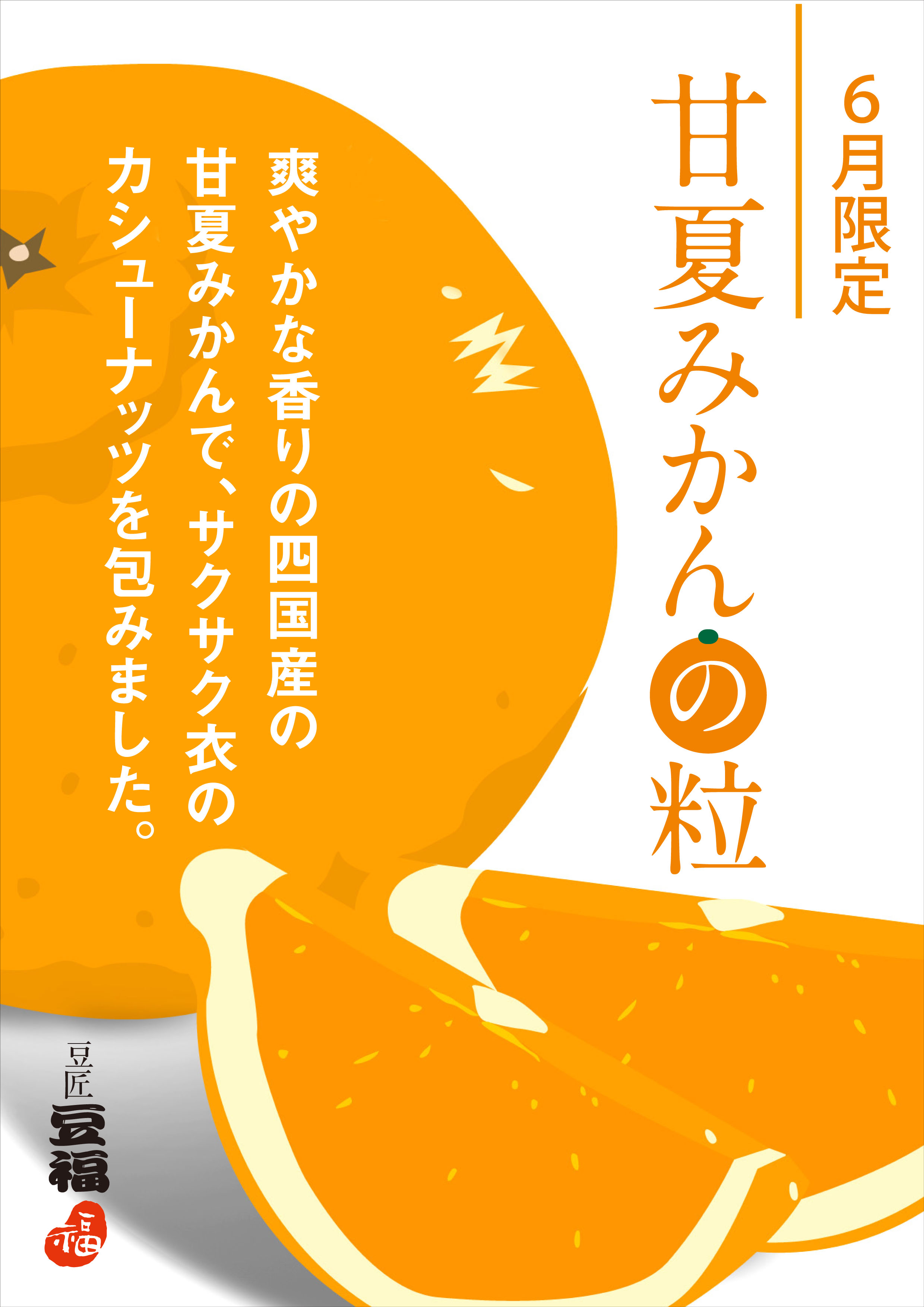 瀬戸内海の穏やかな気候に育まれた四国産甘夏みかんで、サクサク衣のカシューナッツを包みました。甘夏みかんの爽やかな香りと、ほのかな苦みが広がります。